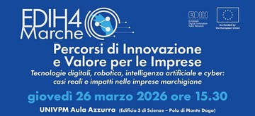 EDIH4Marche, European Digital Innovation Hub della Regione Marche, è lieto di invitarvi a partecipare all’evento “Percorsi di Innovazione e Valore per le Imprese”, dedicato al mondo imprenditoriale marchigiano, in programma giovedì 26 marzo alle ore 15.30 presso UNIVPM di Ancona (Aula Azzurra, Edificio 3 di Scienze, Polo di Monte Dago).